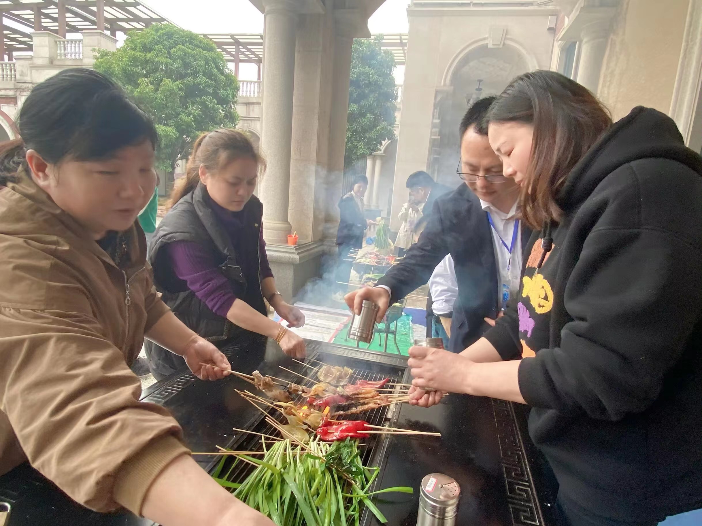 场外也架起了烧烤炉,大家把节日的快乐串成串送给彼此,有了烟火气,才有快乐的味道。