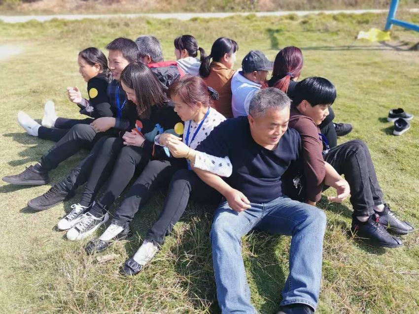最后,大家来到了拓展基地,进行了一些拓展小游戏。其中,“背地起身”是要求整个小分队背靠着背,手挽着手坐在草地上,然后需要在最短的时间内让所有人同一时间站起看见,这个小游戏有一定的难度。只看见大家围着自己的队长热火朝天的商讨着如何同时站起来的技巧。一声令下,加油声也此起彼伏,大家喊着叫着笑着,很快红队以最快的速度所有人同时站起来,大家都高兴坏了,其余两队也纷纷的鼓起了掌祝贺他们。